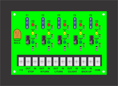 Please fill out the form at the bottom of this pagePlease Verify Your Order:Five Relay, Positive Input, On Indicator. (RCT-00325A-00000)Five Power Relay Control, 12 VDC at 30 ampere, Power relays active with 140 ma, ground. Also provides a positive output when any one of the outputs is active. Often used in "Compartment Light", applications.. FUSES 5 - 20AMP