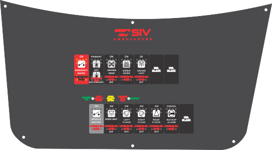|  Faceplate  Plate  Switch 1  Switch 2  Switch 3  Switch 4  Switch 5  Switch 6  Switch 7  Switch 8  Switch 9  Switch 10  Switch 11  Switch 12  Switch 13  Switch 14 | Plate Name: Ambulance Module Switch Part #: FAC-03082, SIV Ambulances Documents: RCT-03082-0__05.pdfCable 1 Name: Blank Cable Cable 2 Name: Blank Cable Switch 1 Name: "EMERGENCY MASTER" Red Switch Cap single White Lens ON-OFF Part #: C-00020-03-0V1D Documents: C-00020-03-0V1D