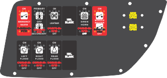 |  Faceplate  Plate  Switch 1  Switch 2  Switch 3  Switch 4  Switch 5  Switch 6  Switch 7  Switch 8  Switch 9  Switch 10  Switch 11  Switch 12  Switch 13  Switch 14  Power Center 1  Power Center 2  Power Center 3  Power Center 4 | Plate Name: Ambulance Dash Switch Part #: FAC-03081, Emergency Mobile Technologies Documents: RCT-03081-0__01.pdfCable 1 Name: Blank Cable Switch 1 Name: "EMERGENCY MASTER" Red Switch Cap single White Lens ON-OFF Part #: C-00020-03-0V1D Documents: C-00020-03-0V1D