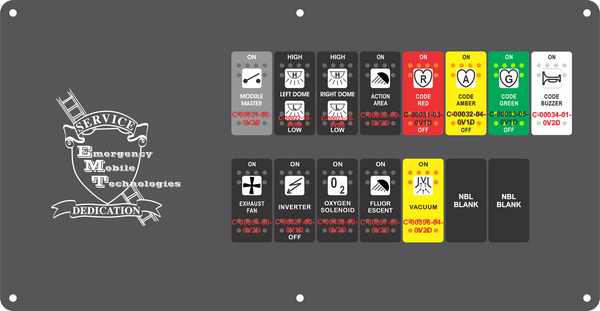 Plate Name: Emergency Mobile Technologies, Module Part #: FAC-02712, Emergency Mobile Technologies Documents: RCT-02712-0__01 EMT.pdf Cable 1 Name: Blank Cable Switch 1 Name: "MODULE MASTER" Grey Switch Cap single White Lens (ON)-OFF Part #: C-00021-02-0V2D Documents: C-00021-02-0V2D
