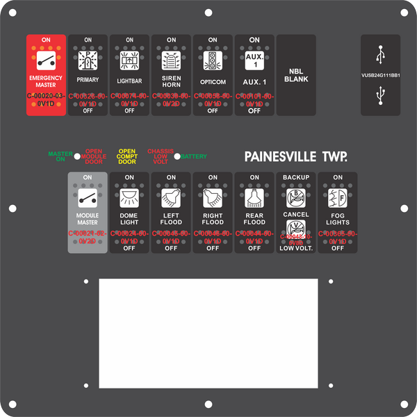 Faceplate  Plate  Switch 1  Switch 2  Switch 3  Switch 4  Switch 5  Switch 6  Switch 8  Switch 9  Switch 10  Switch 11  Switch 12  Switch 13  Switch 14  Switch 15  Power Center 1  Power Center 2  Power Center 3  Power Center 4 | Plate Name: Ambulance Dash Switch Part #: FAC-03023, Painesville Twp. Documents: RCT-03023-0__00, Painesville Twp.pdfSwitch 1 Name: "EMERGENCY MASTER" Red Switch Cap single White Lens ON-OFF Part #: C-00020-03-0V1D Documents: C-00020-03-0V1D