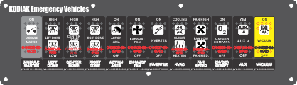 Faceplate  Plate  Cable 1  Switch 1  Switch 2  Switch 3  Switch 4  Switch 5  Switch 6  Switch 7  Switch 8  Switch 9  Switch 10  Switch 11  Switch 12  Power Center 1  Power Center 2  Power Center 3  Power Center 4 | Plate Name: Ambulance Module Switch Part #: FAC-03284, Kodiak Emergency Vehicles Documents: RCT-03284-0__01.pdfCable 1 Name: DAT-01348-04XXX (8 Conductor) Part #: DAT-01348-04XXX Documents: DAT-01348-04XXX, Eight Conductor Data CAble. Eight conductor 22 awg.