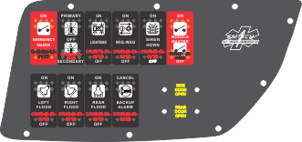 Faceplate  Plate  Switch 1  Switch 2  Switch 3  Switch 4  Switch 5  Switch 6  Switch 7  Switch 8  Switch 9  Switch 10  Power Center 1  Power Center 2  Power Center 3 | Plate Name: Ambulance Dash Switch Part #: FAC-03575, CVU Emtech Documents: RCT-03575-0__00 CVU Emtech.pdfCable 1 Name: Blank Cable Switch 1 Name: "EMERGENCY MASTER" Red Switch Cap single White Lens ON-OFF Part #: C-00020-03-0V1D Documents: C-00020-03-0V1D