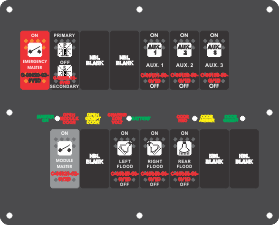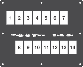 Faceplate  Plate  Switch 1  Switch 2  Switch 3  Switch 4  Switch 5  Switch 6  Switch 7  Switch 8  Switch 9  Switch 10  Switch 11  Switch 12  Switch 13  Switch 14 | Plate Name: Dash Switch Part #: FAC-03564, Phoenix USA Documents: RCT-03564-0__00 Phoenix.pdfCable 1 Name: Blank Cable Cable 2 Name: Blank Cable Switch 1 Name: "EMERGENCY MASTER" Red Switch Cap single White Lens ON-OFF Part #: C-00020-03-0V1D Documents: C-00020-03-0V1D